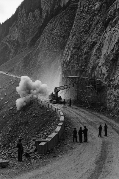 Terenul era atît de abrupt, încît multe porțiuni au fost construite cu schele suspendate în aer, ancorate în pereții verticali ai munților. Imaginile de arhivă arată muncitori și soldați lucrînd la sute de metri înălțime, în condiții care astăzi ar fi considerate aproape imposibile sau neconforme cu normele de siguranță moderne.